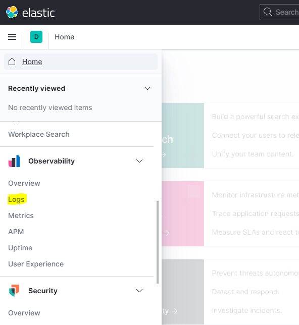 위 URL(설치된 환경의 IP:5601)로 접속하여 “Logs” 메뉴를 선택하여 Filter에 filebeat-* 를 선택해주면 실시간 으로 수집되고 있는 로그를 볼 수 있다.