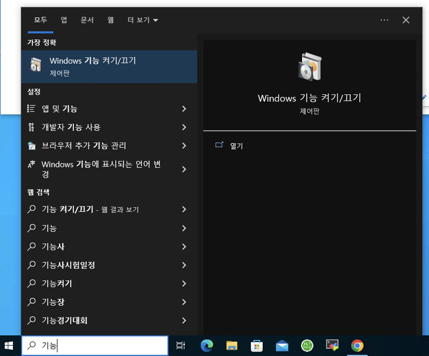 윈도우 탐색창에서 "기능" 이라고 입력하여 "Windows 기능 켜기/끄기" 실행