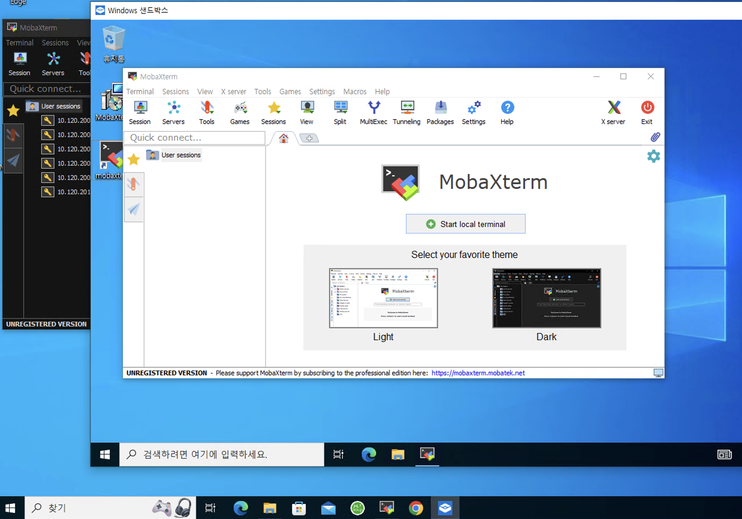 왼쪽(블랙모드)은 Host 환경에서 실행한 mobaXterm이고, 우측(화이트모드)이 샌드박스 안에서 실행한 mobaXterm이다.