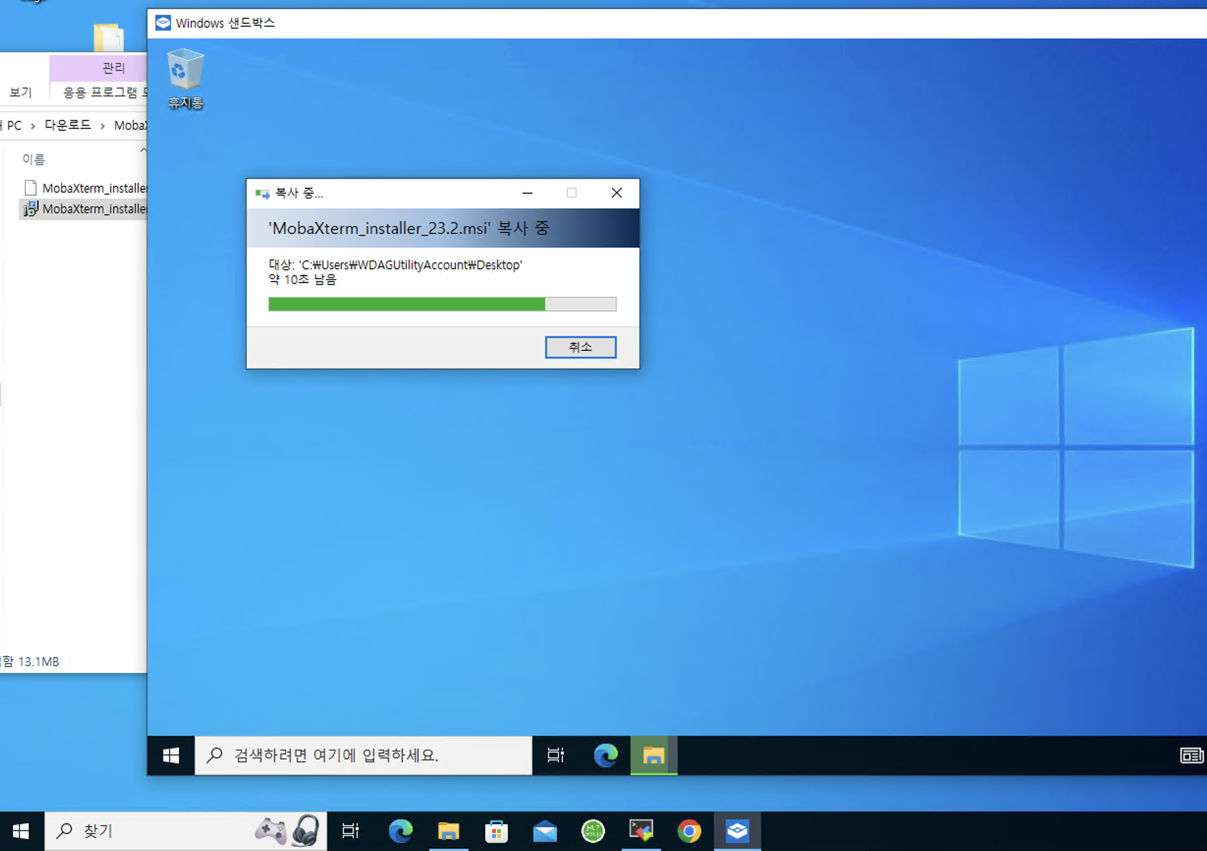 Host 환경에 있던 ssh 접속 프로그램인 mobaXterm Installer 파일을 가상환경으로 복사