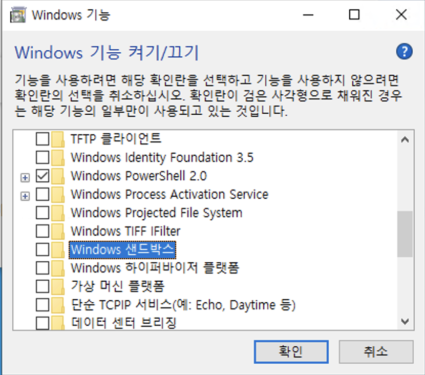 "Windows 샌드박스" 를 찾아서 체크박스 선택 후 "확인" 버튼 선택
