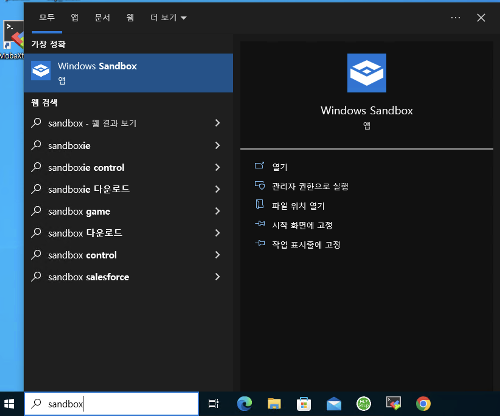 윈도우 탐색창에서 "sandbox" 검색하여 "Windows Sandbox" 실행