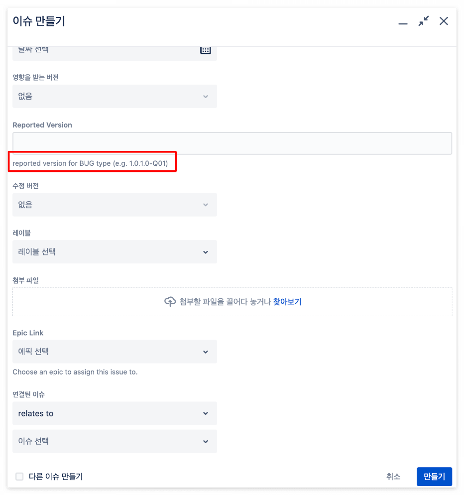그 중, 이슈 발생한 버전을 기재하는 Reported Version 필드가 있는데, 누구는 v를 붙이고 누구는 안 붙이고, 누구는 하이픈(-)으로 연결하고 누구는 언더바(_)로 연결하고, 누구는 온점(.)을 찍고 누구는 안찍고 등등.. 기재하는 스타일이 서로 다를 수 있겠다는 우려가 제기 되었다.