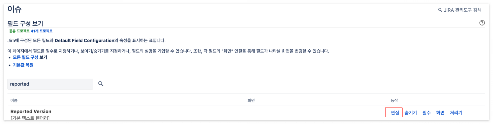 4. 필드 구성에서 수정하고자 하는 필드를 검색하여 찾은 후, "편집" 버튼 선택