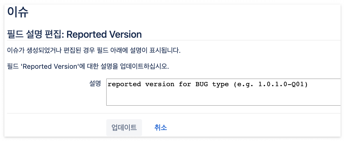 그래서 해당 필드에 이슈를 생성할 때, 하단에 포맷 예시를 넣어두면 동일한 스타일로 맞추기에 좋을 것 같다는 의견이 있어서 Jira 필드에 설명을 추가해 보았다.
