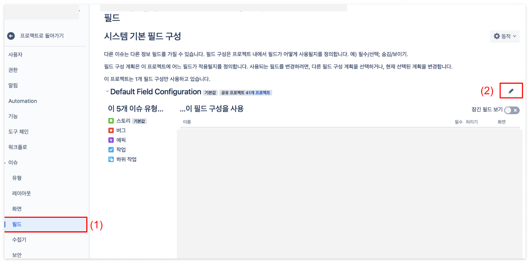 2. 프로젝트 설정 목록에서 "이슈" > "필드" 선택 : 아래 (1) 부분