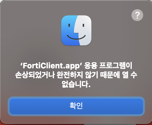 대부분의 데이터와 앱들은 잘 복원이 되었으나 FortiClient.app 은 아래와 같이 아이콘도 x 모양으로 표기되고, 클릭하면 손상 되었다는 에러 팝업이 출력되었다.