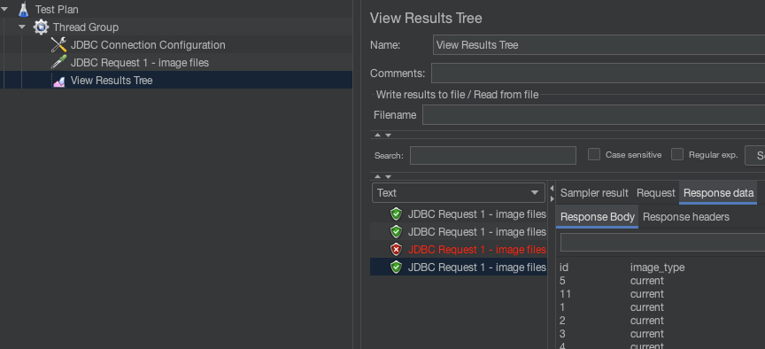 - "JDBC Request" 요소와 "JDBC Connection Configuration" 요소를 연결하려면 "JDBC Connection Configuration" 요소에서 "JDBC Connection Configuration" 드롭다운 메뉴를 선택하고 해당 연결을 선택하십시오.