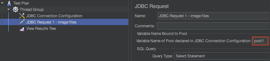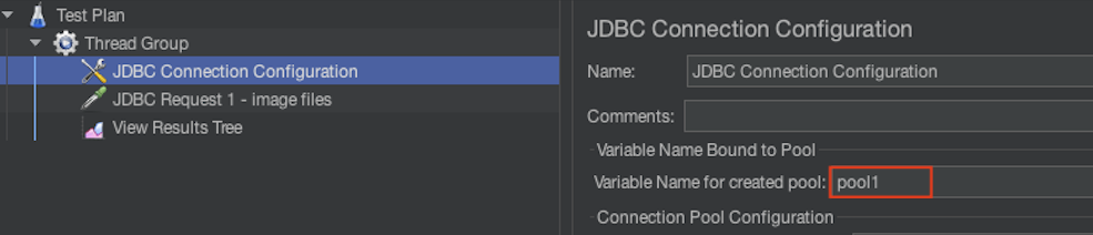 대부분 설명대로 추가하면 되었고, 6번에 JDBC Request와 Connection Configuration 연결 부분 설명이 애매해보여 확인해본 결과, 아래와 같이 pool의 이름을 넣어주고, 해당 이름을 Request에 넣어주어 해결되었다!