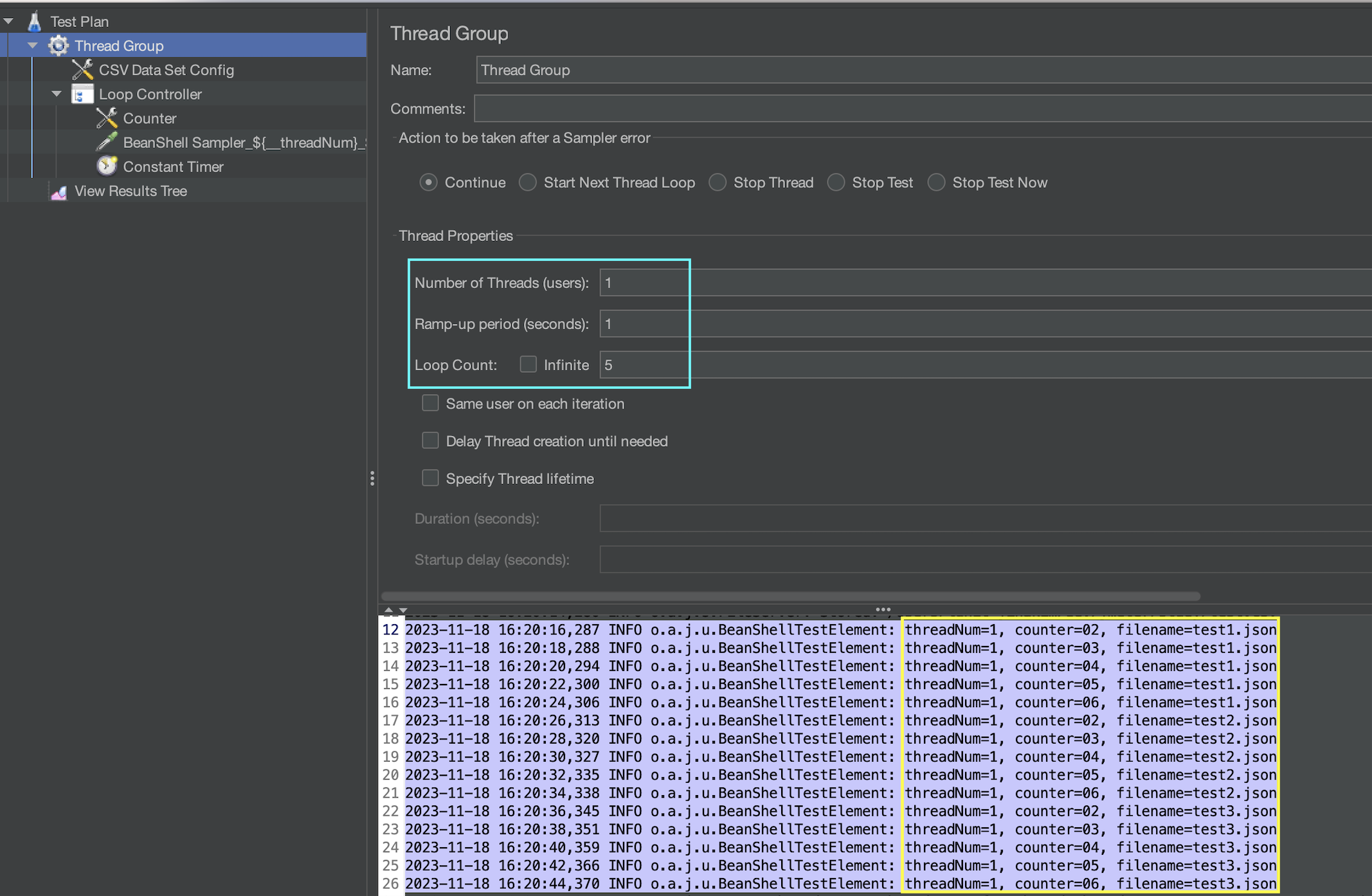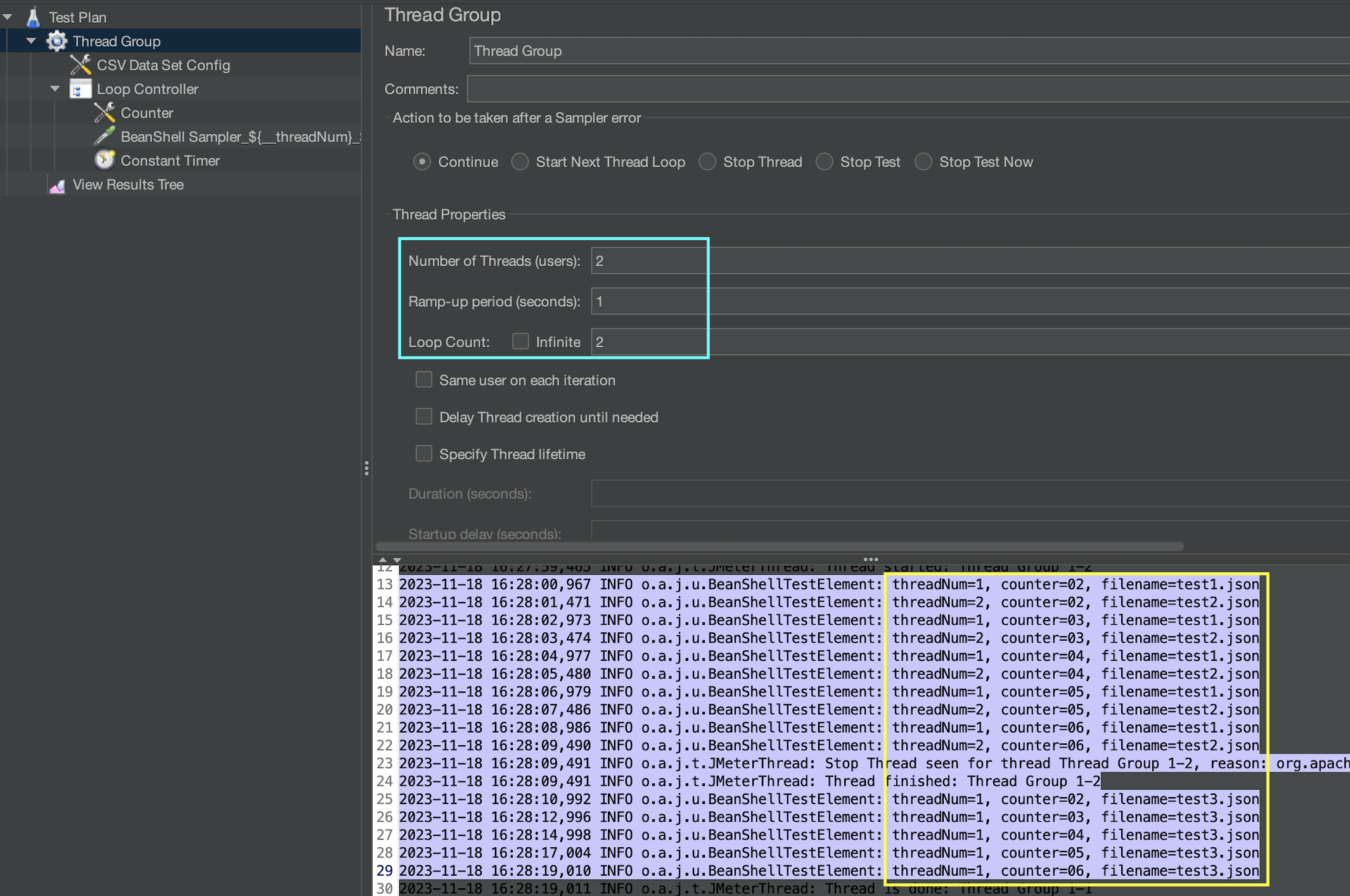 - thread 2개가 실행되어서 thread1이 1번째 행(test1.json), thread2가 2번째 행(test2.json)을 읽어서 각각 5회씩 log를 출력하고, 먼저 5회 수행한 thread1이 3번째 행(test3.json)을 읽어서 다시 5회 log를 출력함. 이때 thread2는 1번 더 loop를 돌았어야 하지만 더이상 읽어올 CSV 데이터가 없기 때문에 loop 수를 만족하지 못하고 종료됨.