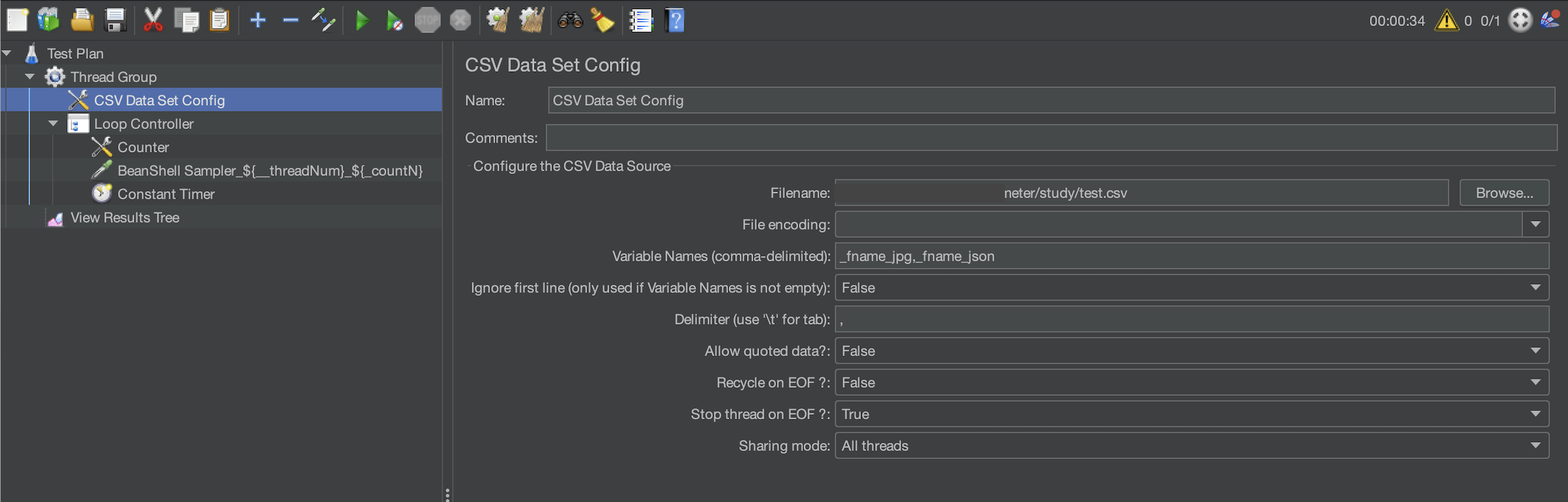 - Sharing mode: 여러개의 thread가 CSV 데이터 1개를 공유할지 아닐지 여부 (All threads를 선택하면 CSV Data를 여러개의 thread가 서로 이어서 다음 데이터를 가져가는 것이고, Current Thread Group은 thread 마다 각자 CSV Data를 가져가는 것이라 각 thread가 처음 가져가는 데이터가 모두 동일하게 첫번째 행이 되는 형태이다.)