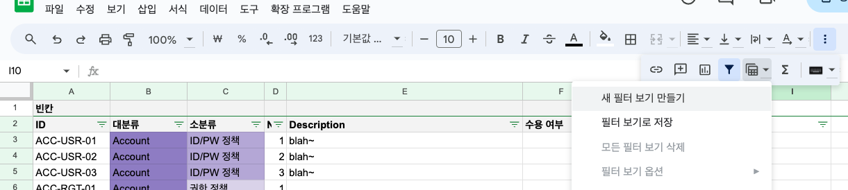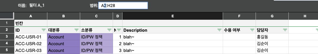 나의 경우 팀에서 스트레드시트를 사용하여 테스트케이스를 관리하고 있는데, 수백개가 넘는 케이스를 보며 테스트를 진행할 때 각자 담당 영역의 항목만 필터링 하여 보기 위해 "개인별 필터"를 적용하여 사용하고 있다.