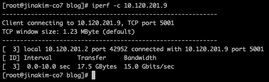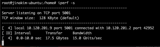 - 아래의 경우 10초 동안 17.5 GBytes를 전송하였고, 전송 대역폭이 15 Gbits/sec 로 측정되었다. (흠.. 왜 이렇게 느린지..)