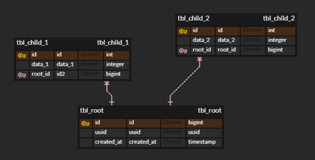 application에서 특정 서비스가 호출될 때마다 tbl_root에 데이터가 추가되고, 그 id를 참조하여 tbl_child1, tbl_child2에 1~N개 까지의 데이터가 추가될 수 있는 구조이다.