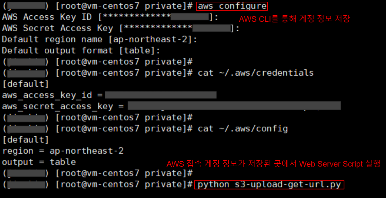 그 부분은 AWSCLI를 설치해서 미리 계정 정보를 등록해 놓은 후, 그 서버에서 flask web server를 실행하는 것으로 해결하였다. 접속 계정 정보를 script에 포함해도 되지만, script source는 팀 멤버들과 공유하는 정보라서 script내에 개인 접속 정보를 등록하지 않기 위해 이런 방법을 사용하였다.