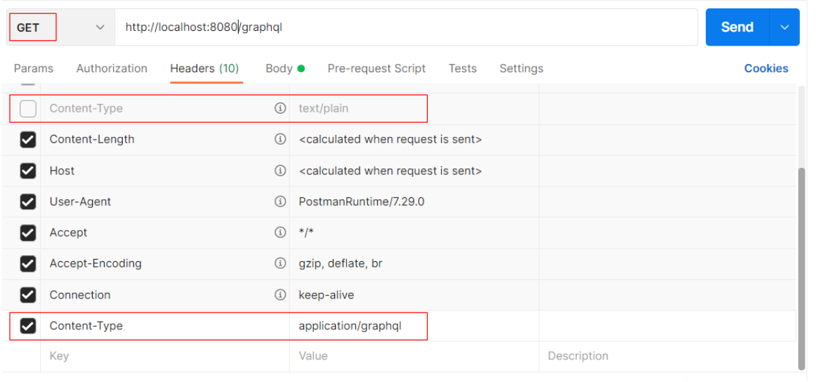 기본 셋팅이 되어 있던 Content-Type을 체크 해제한 후, Content-Type을 추가하고 "application/graphql" 로 입력