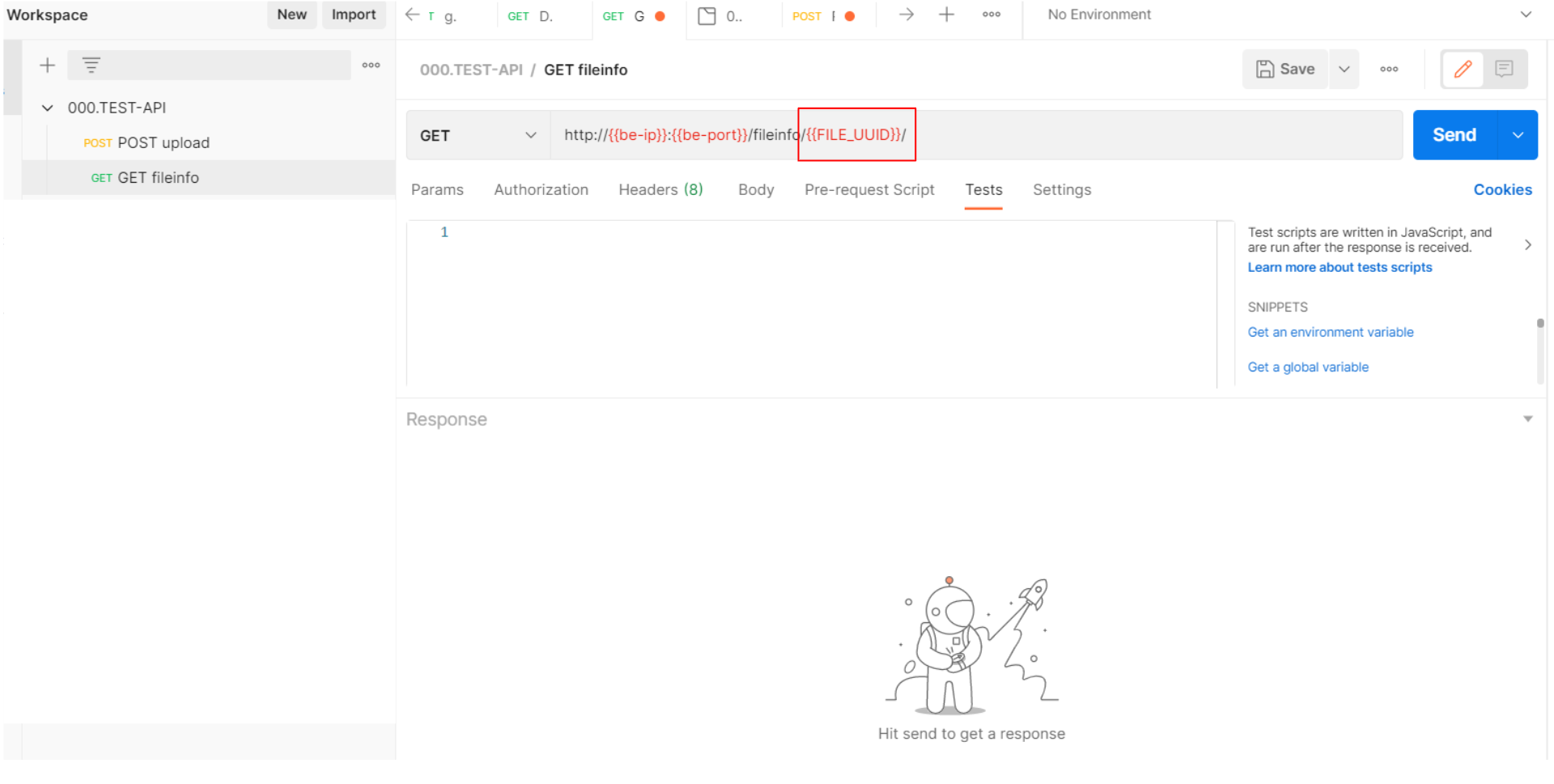 요청 URL에 변수로 저장된 FILE_UUID의 value를 넣어주기 위해 중괄호 2개안에 변수를 입력하여 Request 작성 예제 :
