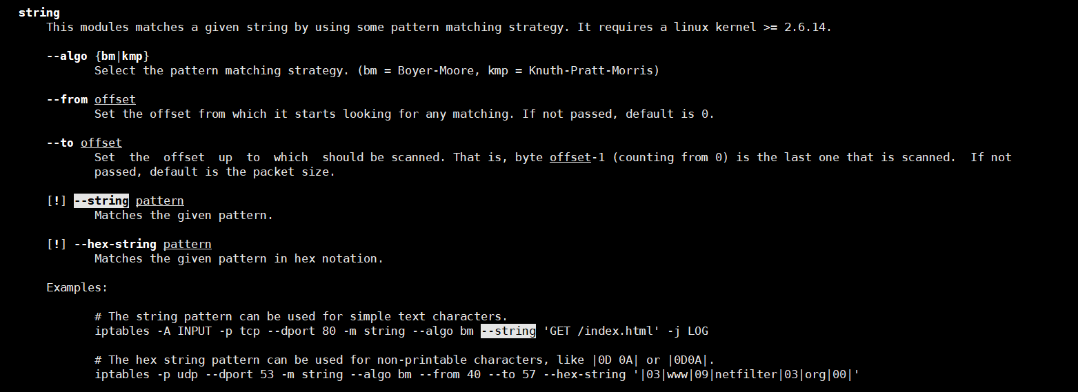 iptables -I INPUT -p tcp --sport 9090 -m string --string "pong" --algo bm -j DROP