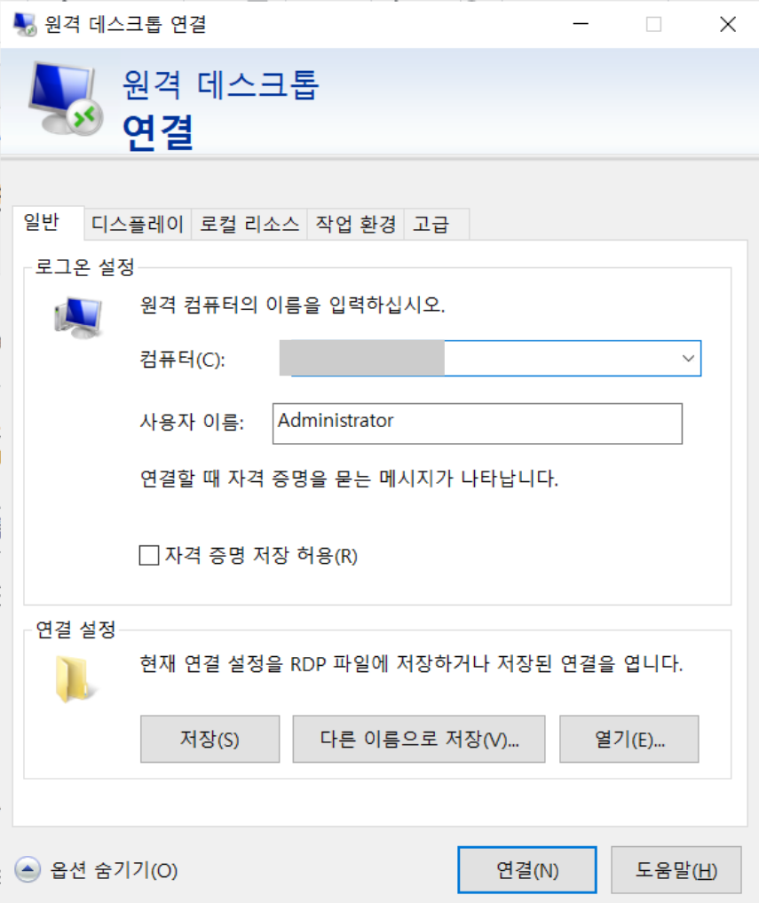 내 PC에서 [Window키] + "mstsc" 를 입력(또는 "원격 데스크톱 연결"을 입력) 하여 아래와 같이 3가지 정보를 입력