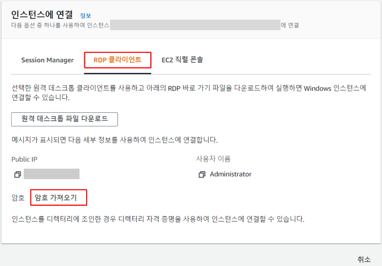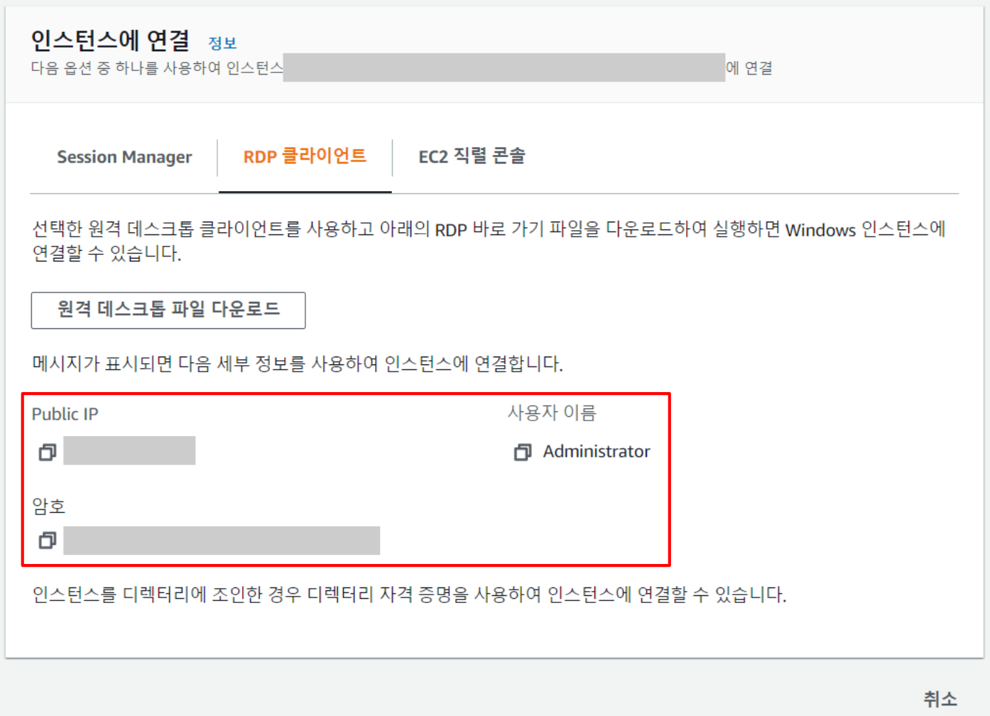 Public IP, 사용자 이름, 암호 : 이 3가지 정보를 통해 내 PC에서 원격 접속을 할 수 있으니 값을 복사해둔다.