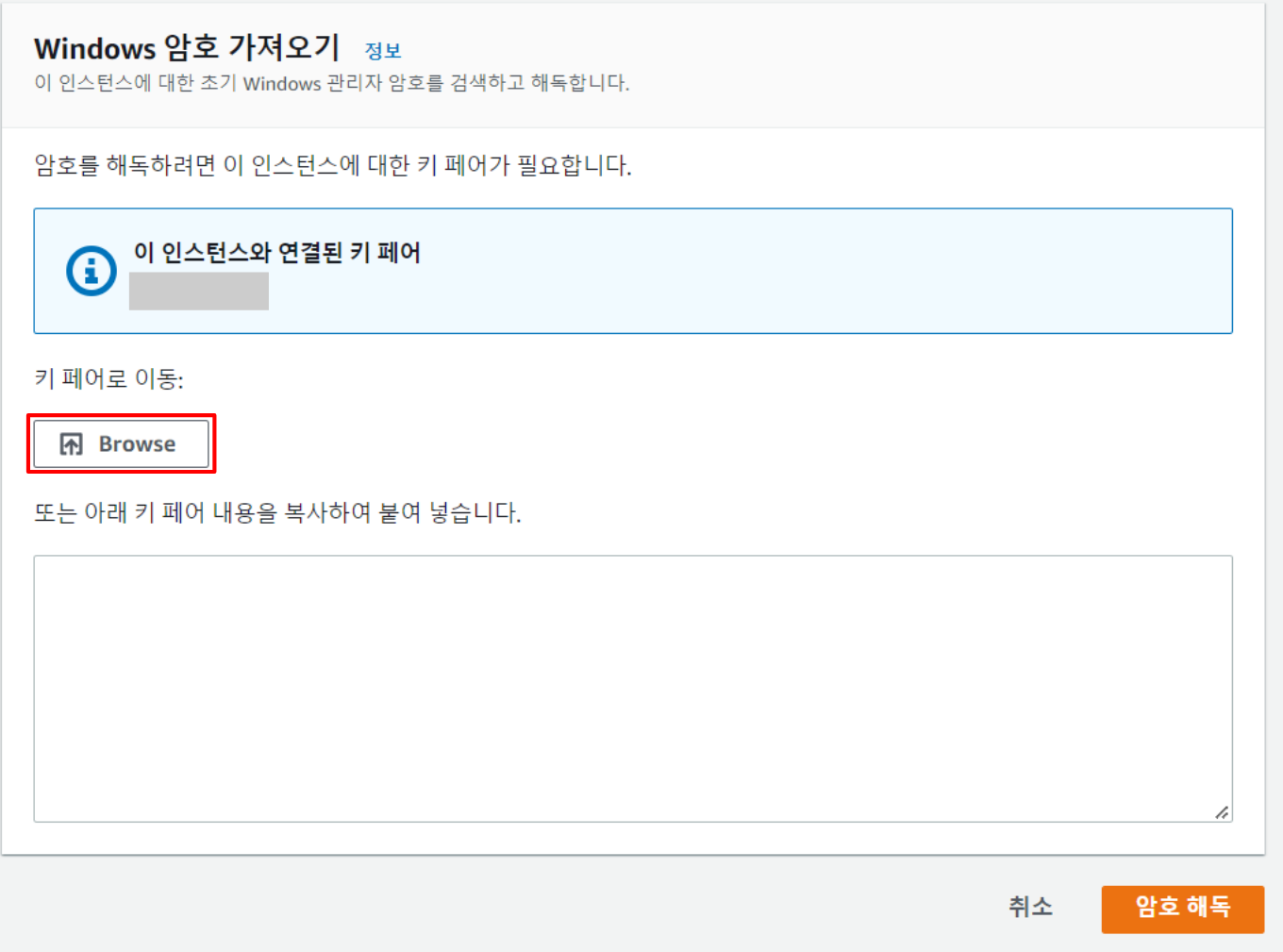 "Browse" 버튼을 선택하여 사전에 접속을 위해 등록했던 OOO.pem 키를 찾아 선택 입력한다.