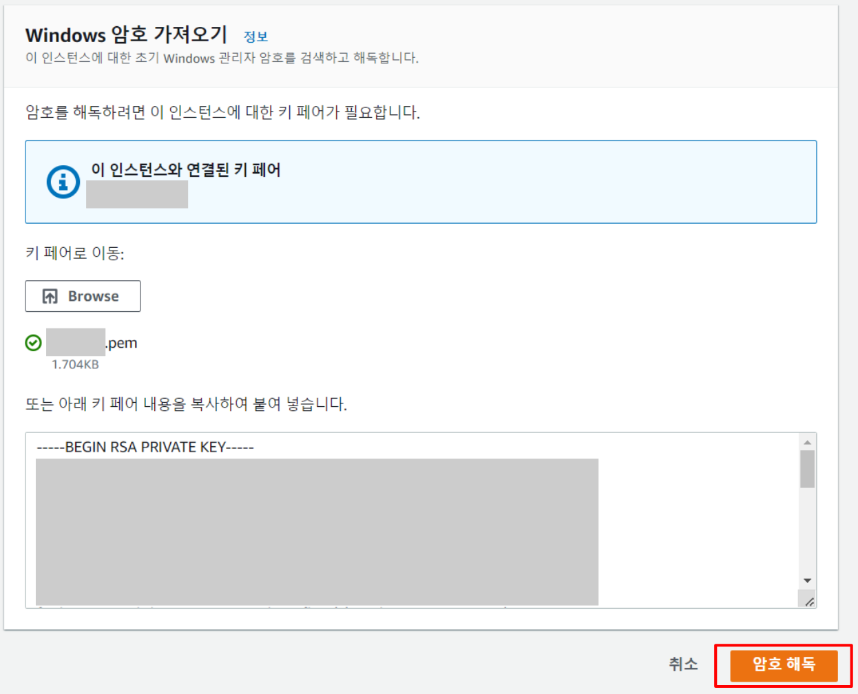 아래와 같이 pem 키를 입력한 화면에서 "암호 해독" 선택