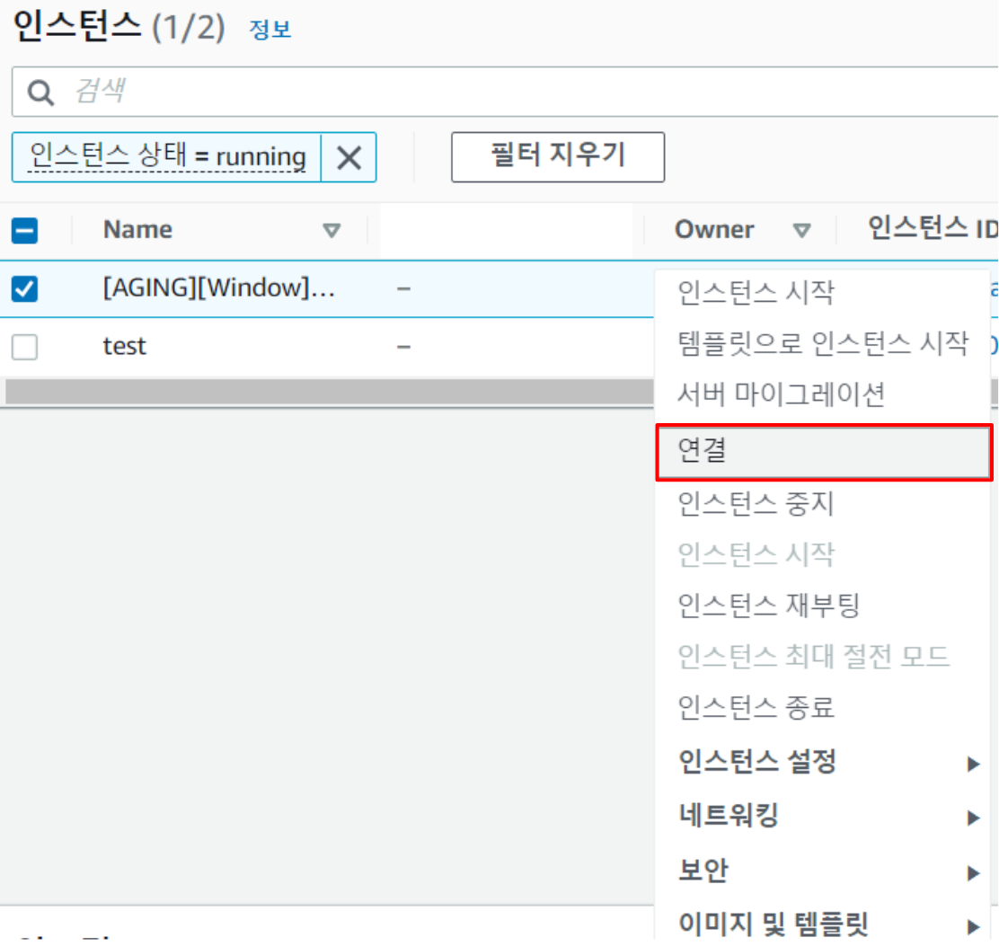 AWS Console 접속 -> EC2 목록에서 Windows Instance 선택 -> 목록에서 우클릭 -> "연결" 선택