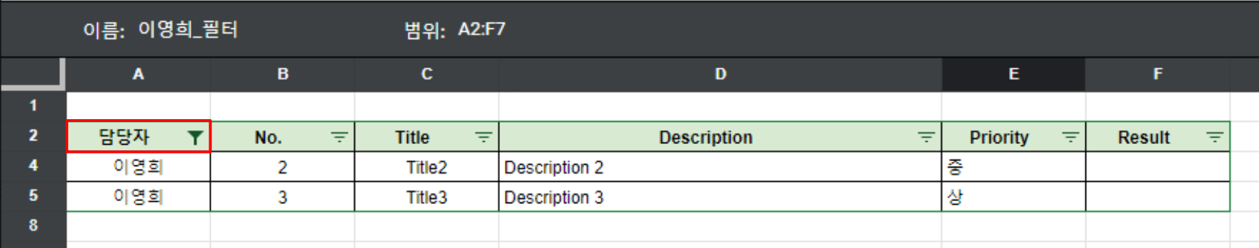 - 예제 화면에서 "이영희" 담당자 부분만 필터 적용해본 화면