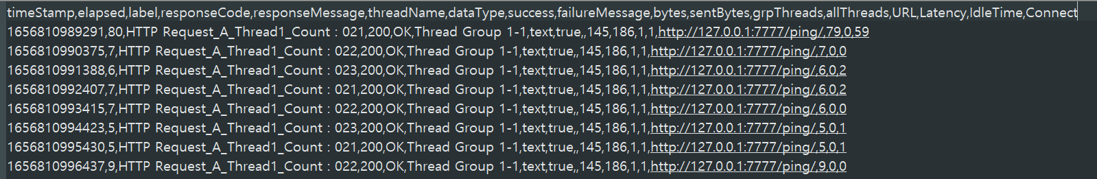 - -l {jtl 결과 파일명} : jtl 파일에 남는 결과는 아래와 같다.