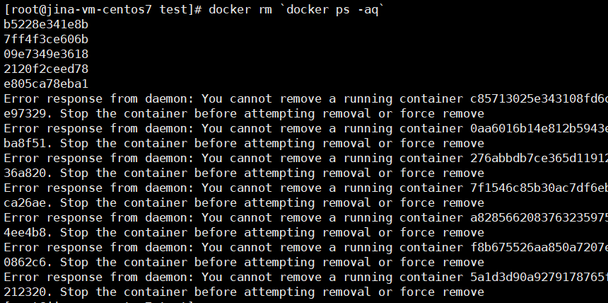 ** 아래 결과를 보면 사실상 모든 container id에 대해 remove 시도를 하지만, 아직 Up 상태(running)의 container의 경우 실행 중인 상태라 삭제가 되지 않음을 확인할 수 있다.