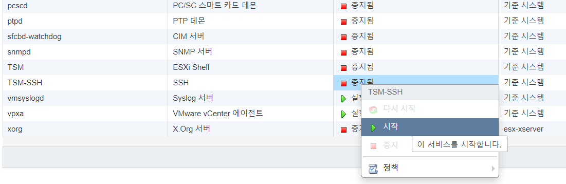 중지됨 상태에서 마우스 우클릭으로 "시작" 선택