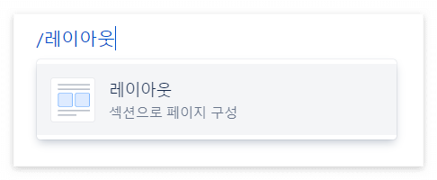 편집 모드에서 상단 도구 메뉴에서 찾아도 되지만, 나는 본문에서 슬래시(/)를 활용하여 주로 기능을 찾고 있어서 아래와 같이 /레이아웃 을 입력하면 아래 선택 가능한 메뉴가 나온다. (나는 한글 모드를 사용하고 있어서 한글 검색으로 가능한데 영문 모드에서는.. 아마도 layout 또는 page layout 등으로 검색이 가능하지 않을까 한다.)