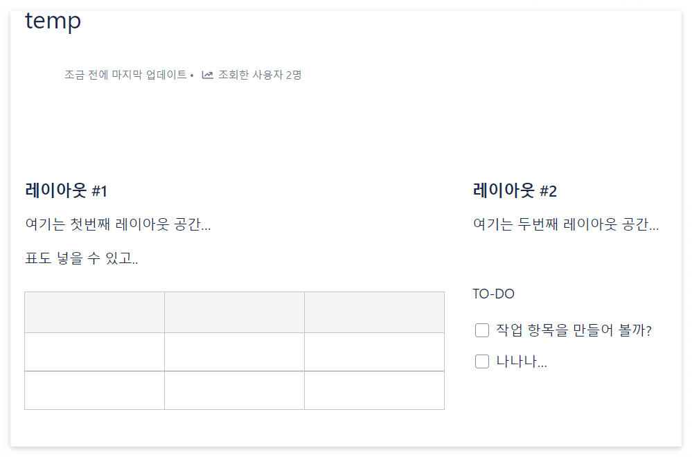 Notion을 사용하면서 한 문서 안에서 레이아웃 변환이 너무 자유로웠는데(마우스 드래그앤 드롭하면 끝..) Confluence에서는 어떻게 해야하지? 안되는 것인가?? 하다가 겨우 발견한(나만 모르려나..) 레이아웃 기능!