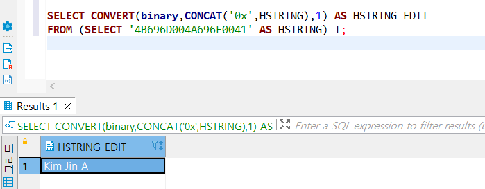 하지만... DBeaver에서는 아래와 같이 잘 실행이 되었으나 SQL Client에서는 hex string 그대로 출력되는 문제가 아직 남았다... 일단 CONVERT 함수까지 진행한 부분까지 기록을...