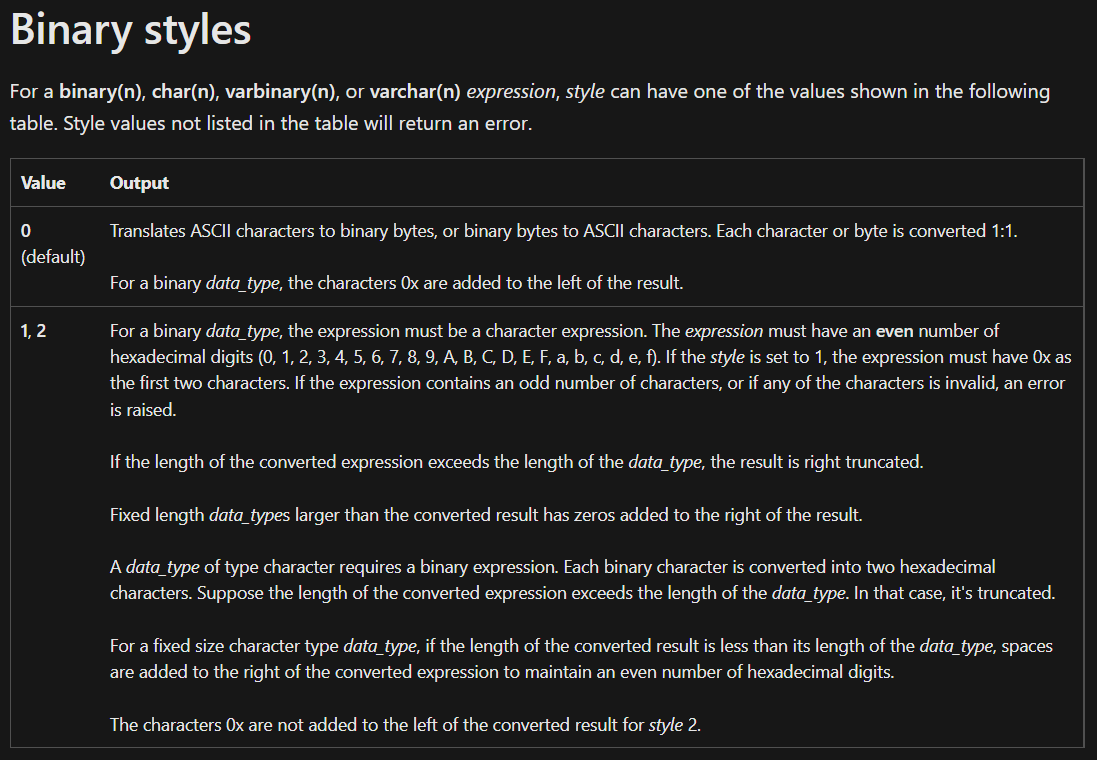 MSSQL에서 ascii hex 값으로 들어가있는 특정 string 값이 있었는데, 그 값을 ascii 문자로 출력을 하고 싶은 니즈가 있었다. 처음엔 PROCEDURE를 통해 2byte씩 잘라서 변환을 해야하나 싶었는데, CONCAT의 Binary Style을 지정하는 것으로 간단히 해결이 되었다.