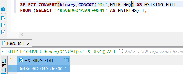 SELECT CONVERT(binary,CONCAT('0x',HSTRING),1) AS HSTRING_EDIT FROM (SELECT '4B696D004A696E0041' AS HSTRING) T;