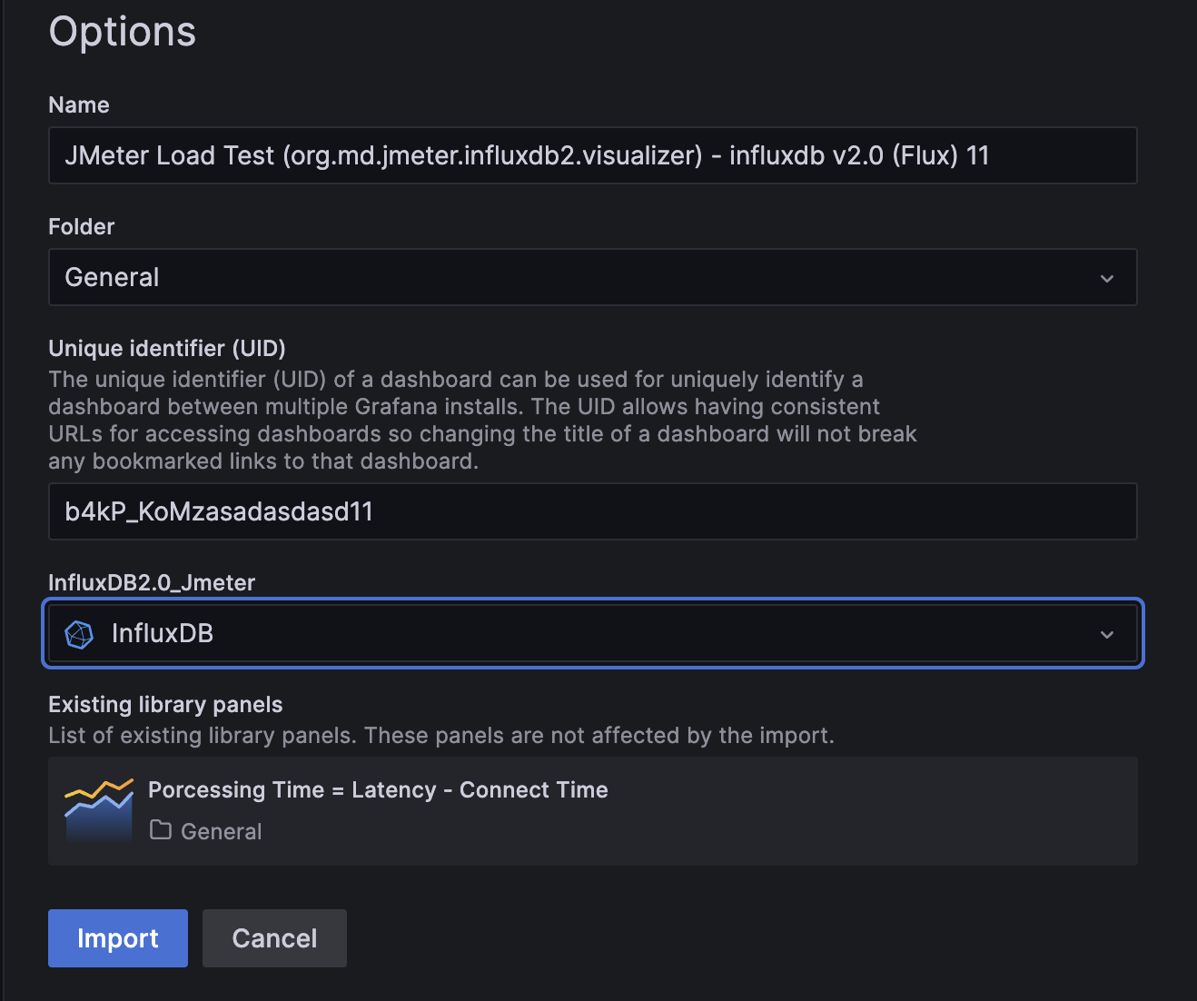 - DB에 InfluxDB 저장소 등록한 것을 선택하고 Import 선택