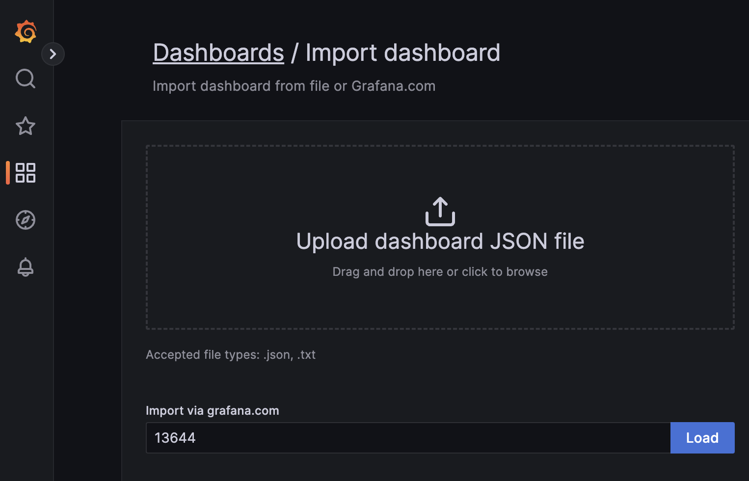 - Import via grafana.com 에 13644 입력하고 Load 선택