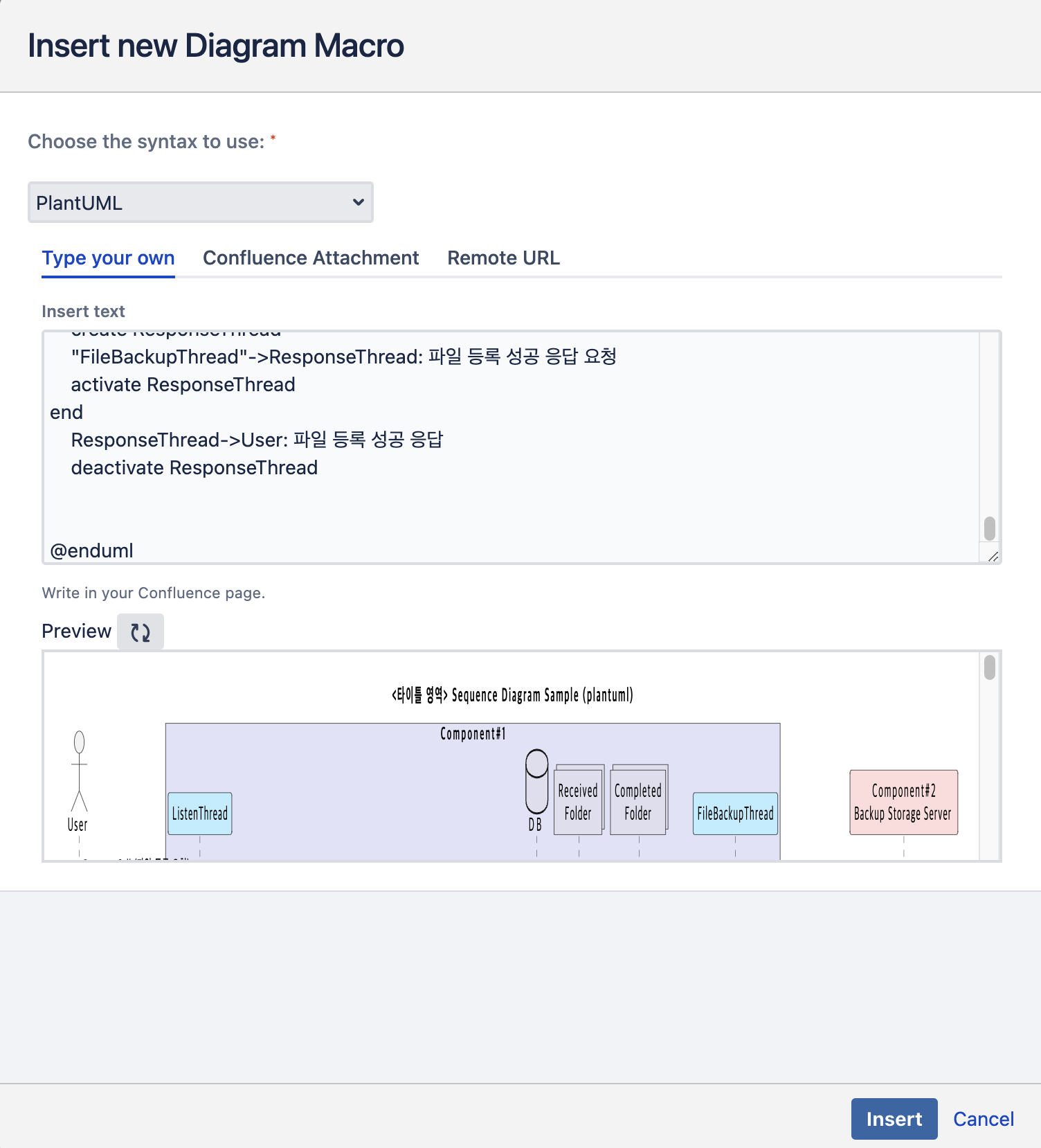 confluence 에서 diagram macro를 사용하면 plantuml 로 작성한 text를 입력하여 diagram 이미지를 생성할 수 있다.
