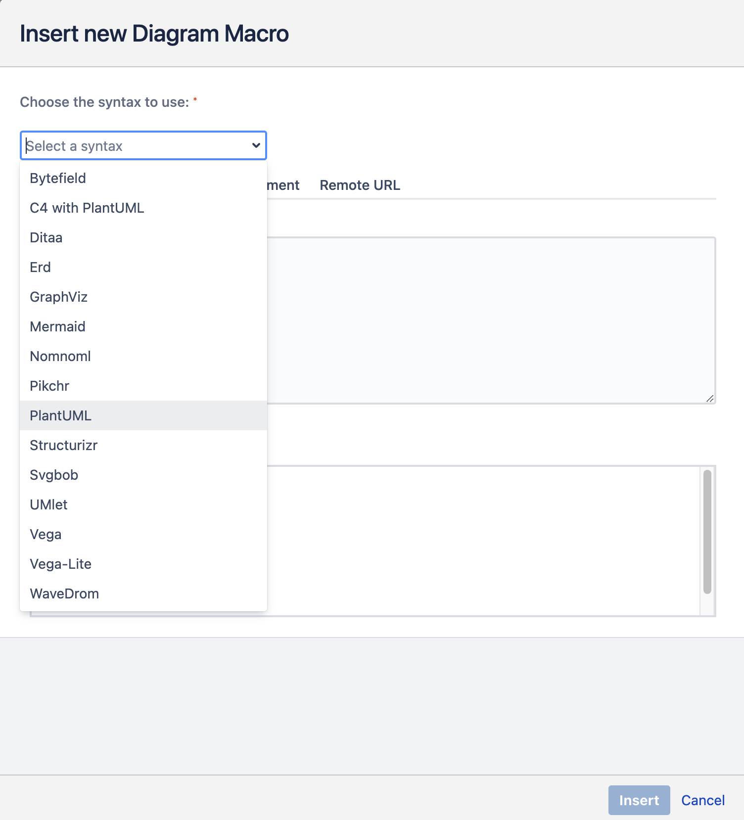 매크로 수정 페이지에서 Select a syntax 드롭다운 메뉴를 선택하여 PlantUML 을 선택한다.